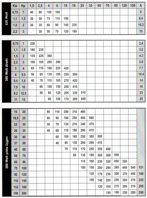 Elektrik Motorları İçin Güç Kablosu ve Sigorta Seçim Tablosu